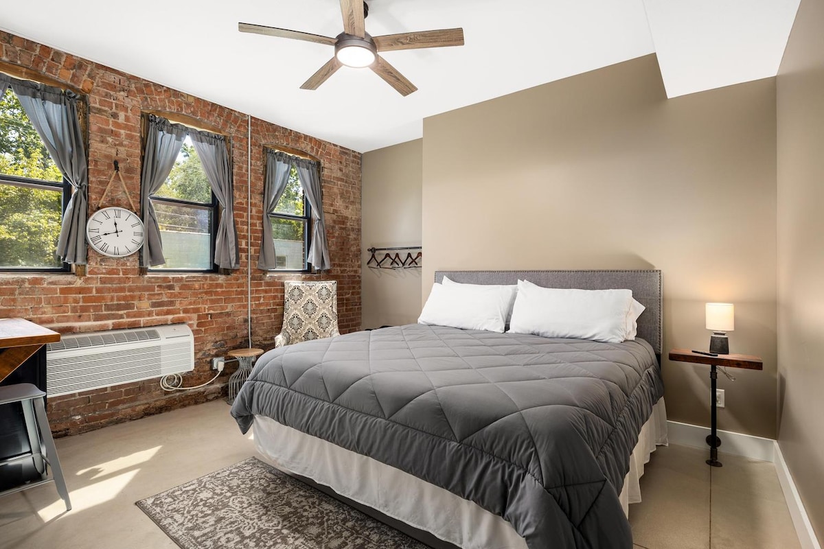 A 30-35 minutos de Bloomington/a 20-25 minutos de Peoria. Ubicado en EUREKA IL. Tres Airbnb. Elegante habitación privada estilo boutique-hotel con acabados de lujo. Paredes de ladrillo en todas partes. Ropa de cama acogedora. Cama tamaño queen. Baño privado. Bar con fregadero. Mininevera. Televisión inteligente. Wifi superrápido. Hay un tramo de escaleras para llegar al segundo piso, donde se encuentran las habitaciones, encima de una cafetería operativa. El personal llega alrededor de las 6:00 a. m. Abre a las 6:30 a. m. Se proporcionan tapones para los oídos y máquina de ruido. NO SE ADMITEN MASCOTAS debido a alergias.
