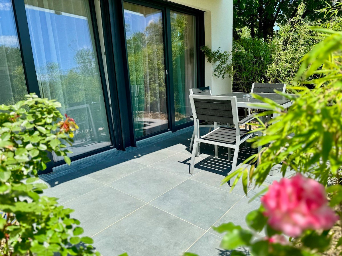 Residencia con jardín: oasis de paz con amplio jardín y terraza Bienvenido a Garden Residence, ¡tu refugio perfecto en una ubicación absolutamente tranquila! Disfruta de las ventajas de un alojamiento elegante y luminoso con una amplia terraza de 20 m2, un jardín de 1400 m2 de uso compartido y un acceso inmejorable a la autopista y al transporte público (a solo 2 minutos). El apartamento está situado en la planta baja de una casa unifamiliar con entrada privada. ¡Se admiten perros!