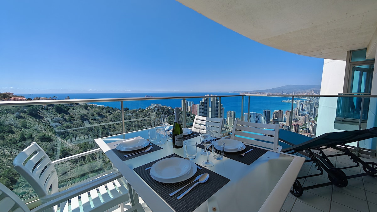 Apartamento con espectaculares vistas a 75 m de playa de la Cala de Finestrat (Benidorm). WiFi 600 Mb. Aire acondicionado en todas las estancias. Piscina, gimnasio, sauna, rodeado de restaurantes, comercios, supermercados, farmacia, mercadillo (martes y sábado). Bus y Taxi. Cocina: lavadora, horno, lavavajillas, microondas, cafetera, batidora, plancha, menaje completo, kit de bienvenida (botellas vino blanco y tinto). Baño con plato ducha, accesible, secador, amenities. Cuna bebé/trona gratuita.