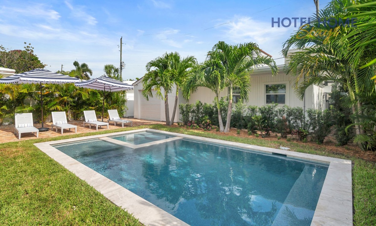 Deja atrás todas tus preocupaciones y disfruta de una piscina privada de agua salada climatizada y jacuzzi en una casa con un hermoso patio trasero. Hay TV por cable y wifi en la casa. 1 TV en la sala de estar y 1 en el dormitorio principal. Capacidad para 6 adultos y ofrecemos 2 cunas para un bebé o niño pequeño. La cocina está recién reformada, lo que facilita cocinar y entretenerse. Estamos a solo 7 minutos del Aeropuerto Internacional de Palm Beach. Descuento disponible para alquileres mensuales.