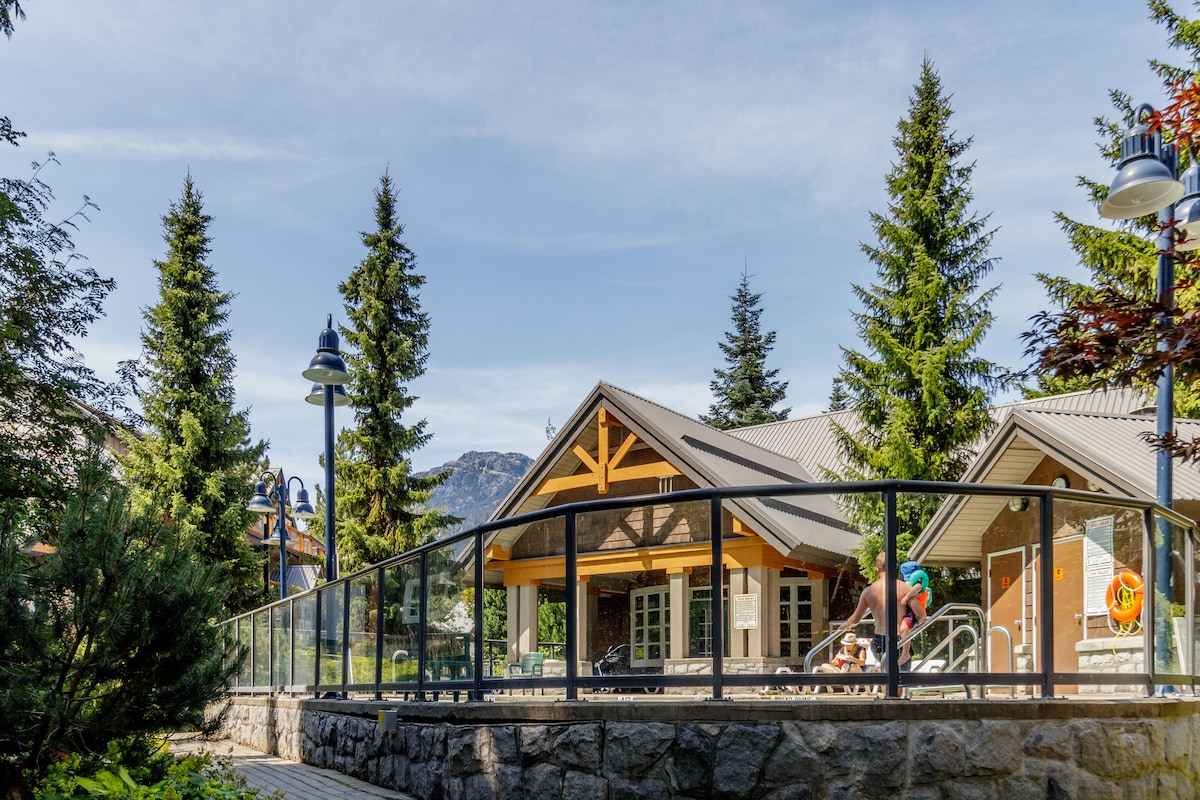 Te damos la bienvenida a tu oasis de montaña. ¡A 1 minuto a pie del remonte Blackcomb! Nuestro moderno apartamento es un luminoso y espacioso apartamento de 1 dormitorio con ventanas envolventes para unas vistas perfectas a los árboles y a las montañas. ¡Mira hacia arriba a la montaña Whistler mientras bebes café desde la mesa de tu cocina! La suite lo tiene todo: - cama king - Sofá cama. - Cocina completa con lavavajillas nuevo - bañera DE hidromasaje - Keurig - Altavoz Bose - Aire acondicionado central, actualizado en julio de 2025. El edificio cuenta con gimnasio, lavandería, piscina y bañera de hidromasaje al aire libre.