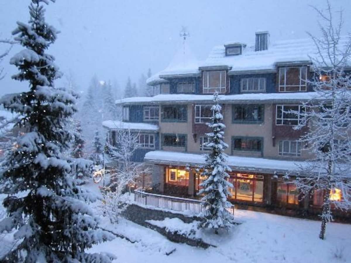*Ahorra en las tarifas reducidas de principios de invierno debido al cierre de la bañera de hidromasaje y el gimnasio* ¡Pueblo principal y céntrico con vistas al famoso paseo Whistler Village Stroll! Este apartamento tipo estudio fue renovado en julio de 2021. Tiene de todo: aparcamiento gratuito (también algunas plazas para vehículos eléctricos), capacidad para 4 personas en la cama tamaño king y el sofá cama tamaño queen, cocina totalmente equipada, experiencia de baño tipo spa con ducha de efecto lluvia, chimenea, TV inteligente de 50 pulgadas con Netflix y cable, altavoz Sonos, iluminación regulable y lavandería en la suite. A poca distancia a pie de telecabinas, tiendas y restaurantes.