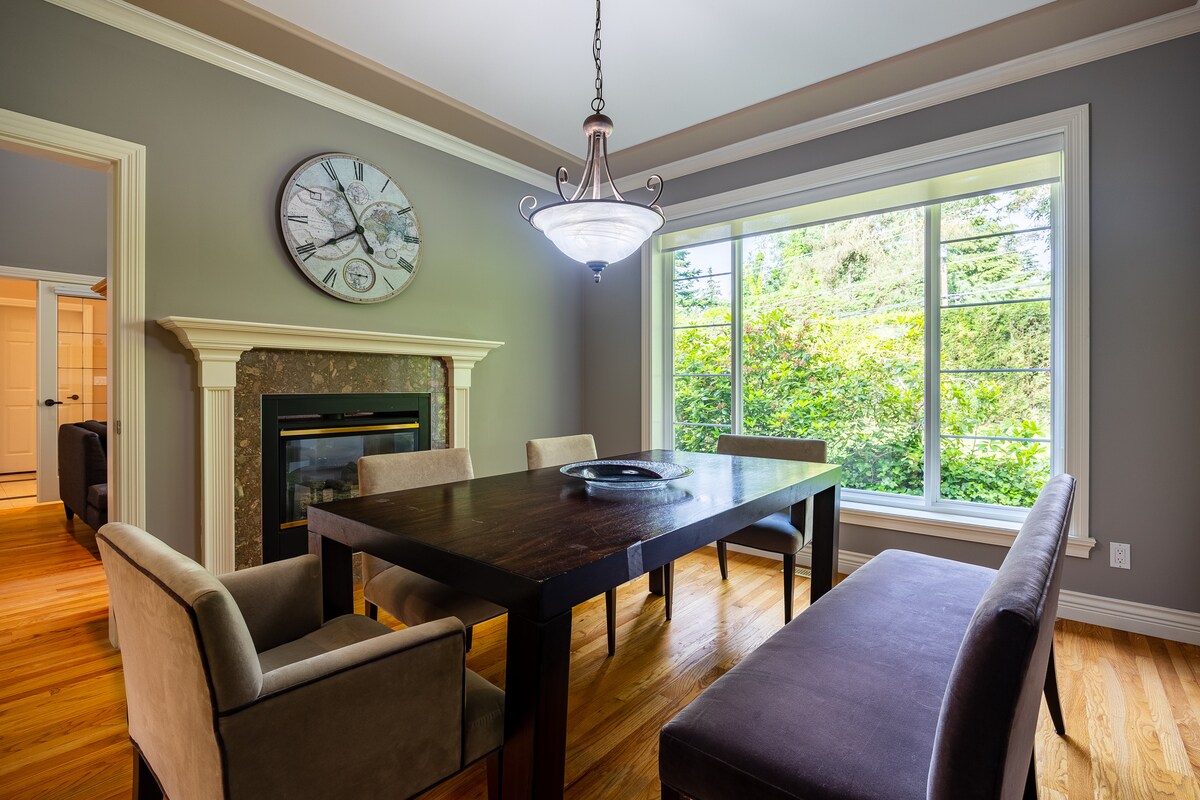 Bienvenido a esta hermosa casa de 5 dormitorios en South Surrey, donde el estilo y la comodidad se unen. Ubicada en un barrio tranquilo y familiar, esta espaciosa casa es perfecta para grupos, familias o cualquier persona que busque un refugio tranquilo. La casa cuenta con 5 dormitorios, 5 camas, un sofá cama tamaño queen, colchones de aire (según el número de huéspedes), 2,5 baños, 2 cocinas totalmente equipadas y una chimenea eléctrica personalizada iluminada por LED para crear un ambiente acogedor.
