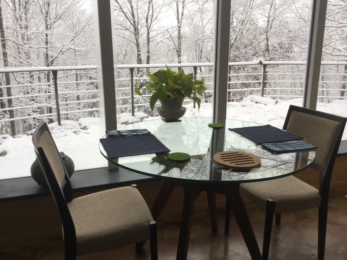 Rodéate de naturaleza y acogedora comodidad moderna. El romántico chalet de estilo mid-mod está detrás de 10 acres de bosque tranquilo, pero a solo 12 minutos en coche de Mount Snow para practicar esquí. A 3 minutos del embarcadero del precioso lago Whitingham, donde puedes alquilar motos acuáticas y barcos o ir a nadar y pescar. Senderismo hasta la encantadora ciudad de Wilmington, con sus cafeterías y restaurantes. Piscinas y jacuzzi en la carretera en la casa club. A pocos pasos de iceskating, pickleball, senderismo y senderos para motos de nieve.