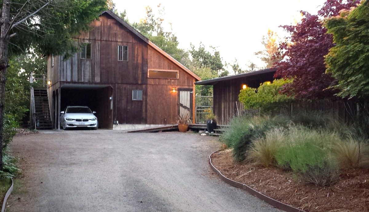 Havens Neck "Barn" diseñado por el arquitecto de San Francisco David Crimmin. rustic en el exterior, se adapta al entorno forestal. El moderno interior tiene techos abiertos de 11'-0" y suelos de hormigón calentados. Al oeste de la autopista 1, cerca de Anchor Bay. Cálido y protegido del viento. Vistas al agua azul filtrada. ** Nota: la bañera de hidromasaje de leña no está operativa actualmente (la foto es solo para las vistas del patio delantero).