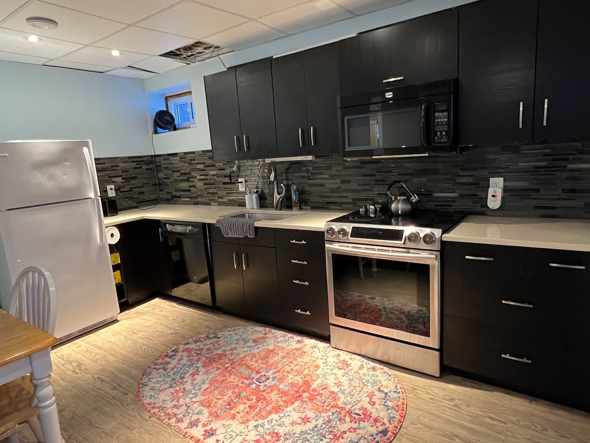 El apartamento de 1 dormitorio en el sótano tiene una cocina funcional que viene con placa de cocción, nevera, microondas, hervidor de agua, cafetera, cubiertos y utensilios básicos de cocina y servicio para tu uso. La habitación cuenta con todas las comodidades de un hogar con una cama tamaño queen que es cálida y acogedora para un sueño perfecto. Se proporcionan toallas frescas y limpias. Se encuentra en el entorno sereno de la ciudad con un sistema de autobuses de tránsito funcional. Aparcamiento disponible en la entrada. Se puede facilitar habitación privada adicional si es necesario por una tarifa adicional.