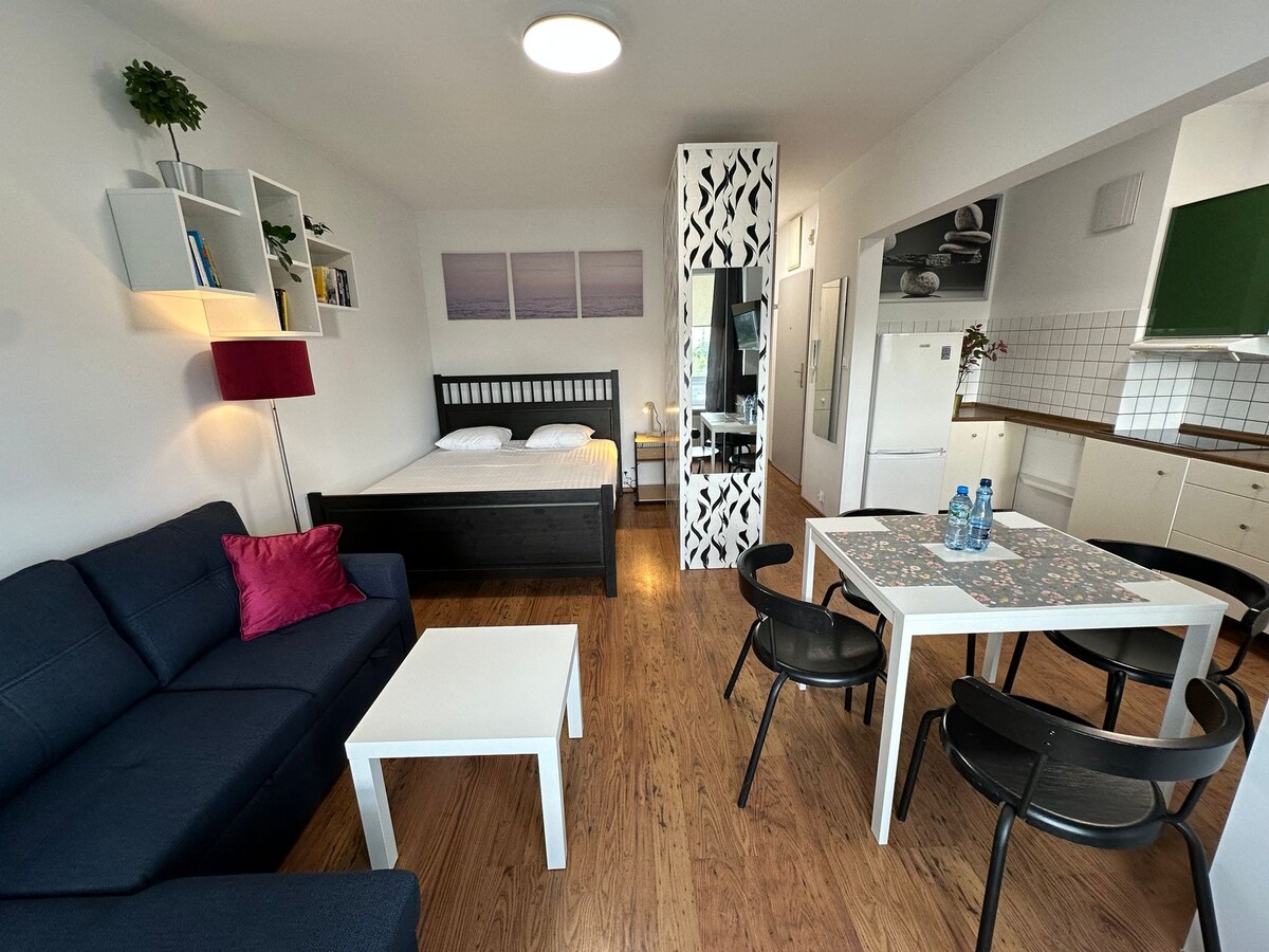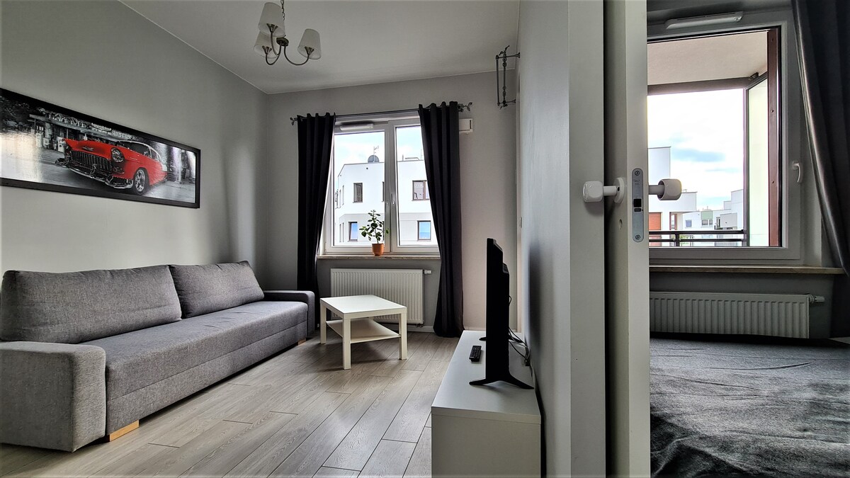 Apartamento cómodo y totalmente equipado en un edificio nuevo. Sala de estar con cocina abierta dividida en comedor y sala de estar. El dormitorio tiene una cama grande y un armario espacioso. También hay un armario como espacio de almacenamiento adicional. En la zona hay tiendas, restaurantes y cafeterías. Equipamiento: aire acondicionado, cafetera, hervidor de agua, plancha, tabla de planchar, lavadora Cómo llegar desde el aeropuerto de Chopin 20 minutos en taxi 50 minutos en transporte público desde el aeropuerto de Modlin 50 minutos en taxi 120 minutos en transporte público