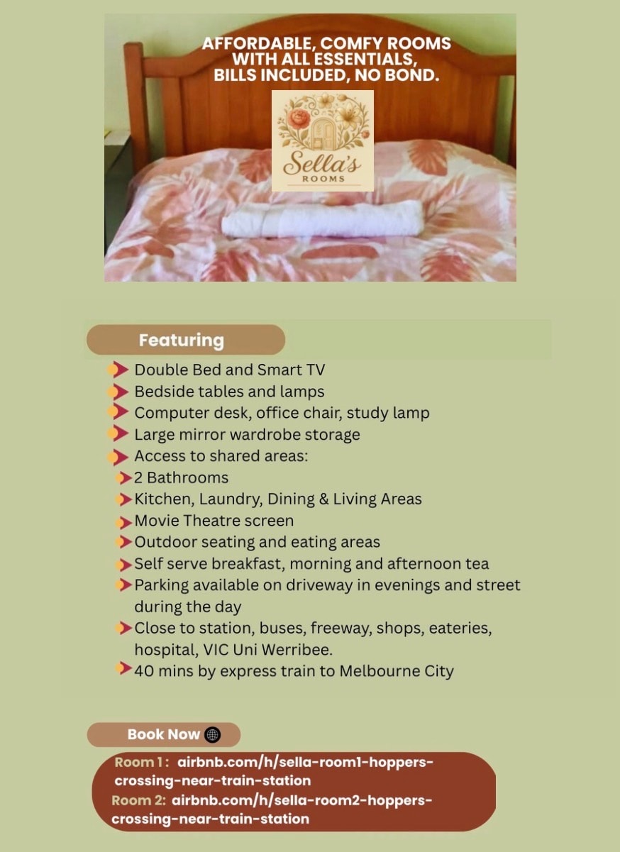 Relájate en este tranquilo alojamiento cerca de la ciudad de Melbourne. Cerca de varios servicios: autobuses, estación de tren, hospital, centros comerciales, bibliotecas y restaurantes, a 10-20 minutos a pie. Playas a 30 minutos. A 30 minutos del distrito financiero (ciudad) o a 35 minutos de Geelong. Trenes exprés. También cerca de atracciones turísticas: Wyndham Harbour, Werribee Mansion y Werribee Open Range Zoo accesibles en autobús. Desayuno básico, té de la mañana/tarde y la mayoría de los servicios: gas, electricidad, agua, wifi incluidos.