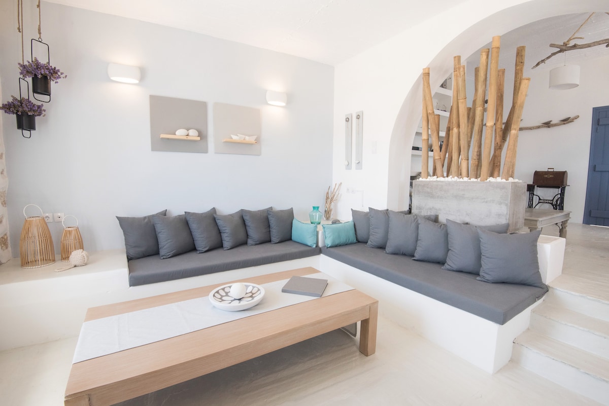 Ione es una tranquila residencia junto al mar en Naousa Paros, ubicada entre las playas de Xifara y Lageri, que se extiende sobre una superficie de 9 acres. El punto de referencia de esta casa minimalista es que está situada a pocos metros del mar, muy cerca de las playas más bonitas de la isla y a solo 3 km del bullicioso centro de Naousa. Nuestra misión es ofrecerte una hospitalidad única para disfrutar de unas vacaciones inolvidables.
