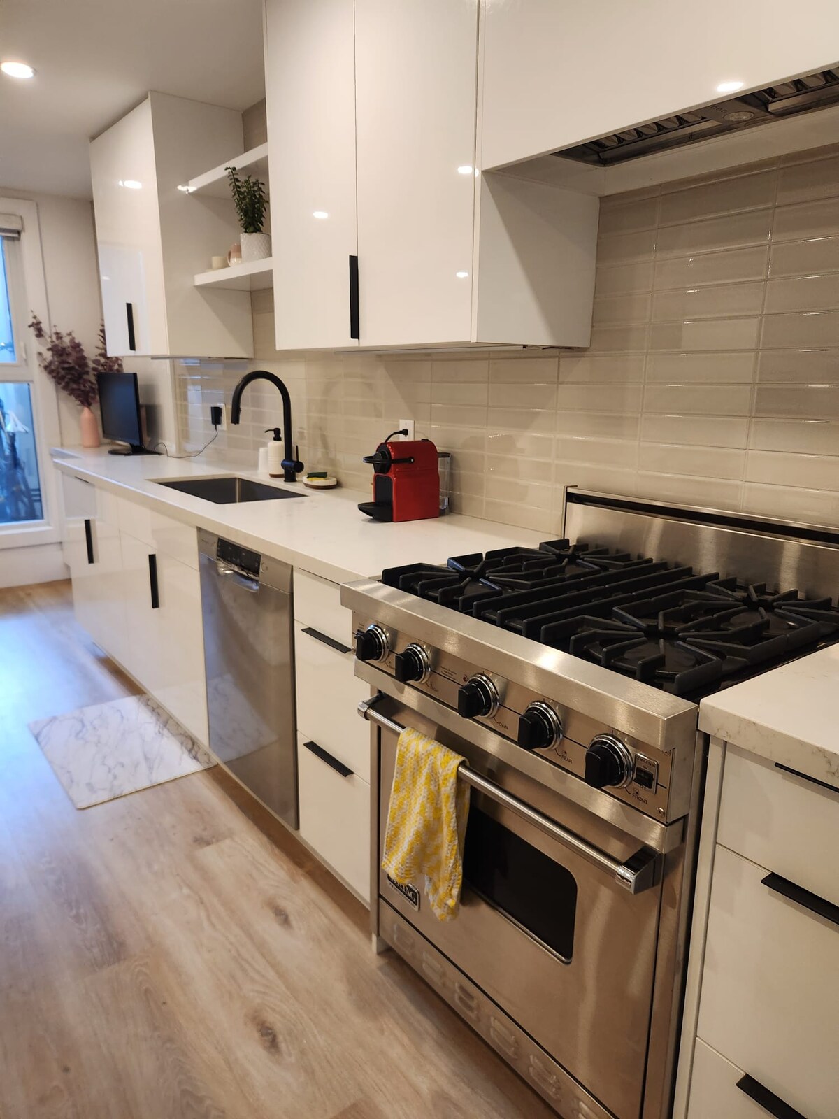Los madrugadores disfrutarán de la luz de la mañana que fluye a través de la ventana, mientras que los amantes de la noche apreciarán las cortinas opacas. Ofrecemos una entrada sin llave, una hermosa y espaciosa ducha a ras de suelo, techos extra altos, una cafetera Nespresso, TV inteligente, wifi y una cama tamaño queen súper cómoda que en realidad es una cama Murphy, ¡y se puede convertir fácilmente en un sofá!