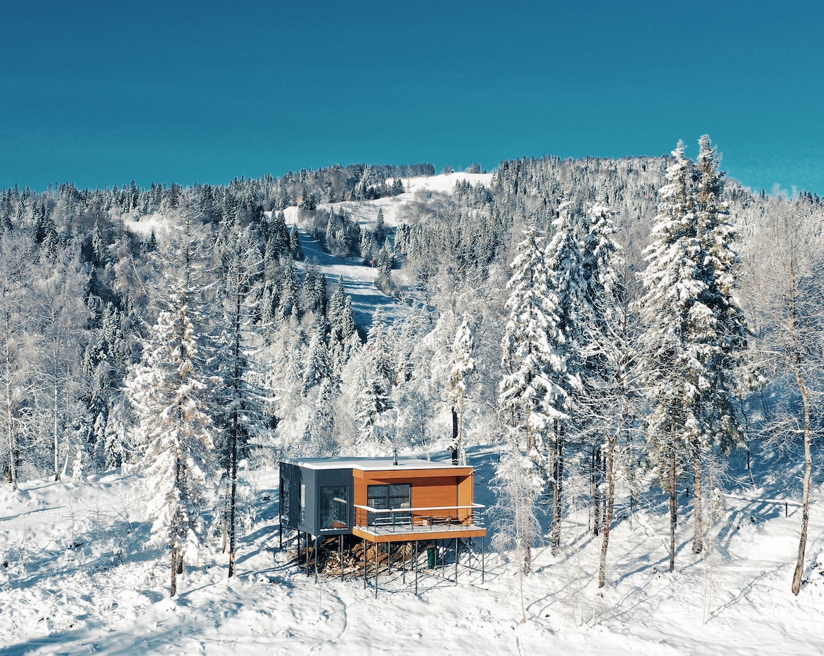 Las cabañas de diseño japonés contemporáneo se encuentran en una cordillera en el pueblo de Volosyanka Lviv Del centro del pueblo a la distancia de la casa 5 km A poca distancia a pie de la montaña Ilsa (1066 m) con el mismo nombre complejo y pista de esquí Área propia de la casa — 0,25 hectáreas, que ofrece unas vistas increíbles del monte Alto. arriba de Zahar Berkut, montañas de Bliznytsia, Ilsa y Trostyan El complejo está bordeado por tierras forestales