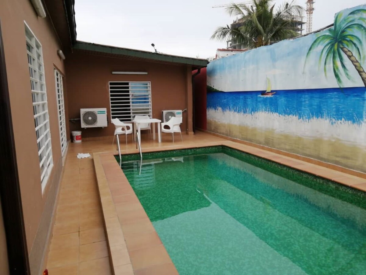 Bonita villa familiar con piscina privada situada en una zona tranquila en pleno centro de Abiyán. Es una villa de dos dormitorios, con un gran salón y una azotea muy agradable con una piscina justo enfrente. Se trata de una propiedad que consta de dos casas separadas por un gran jardín. El acceso para los viajeros es independiente y la piscina está a su entera disposición durante su estancia. La sala de estar y los dos dormitorios tienen aire acondicionado.