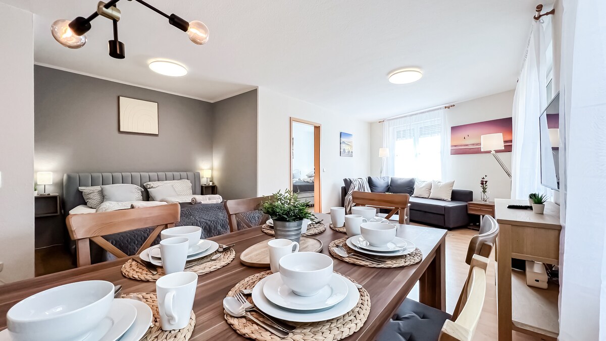Apartamento de unos 40 metros cuadrados, limpio y luminoso, con cocina americana, sala de estar y dormitorio separado. Baño muy bonito y luminoso con ducha, inodoro y sauna integrada para 2 personas (Klafs). Ideal para relajarse después de pasear en la temporada de frío. El apartamento se encuentra en el tercer piso y tiene su propia entrada independiente. Los propietarios viven en el mismo edificio. El apartamento tiene un aparcamiento cerrado. Las bicicletas se pueden estacionar de forma segura en el patio. Ambiente moderno.